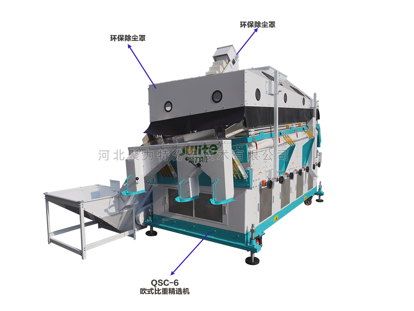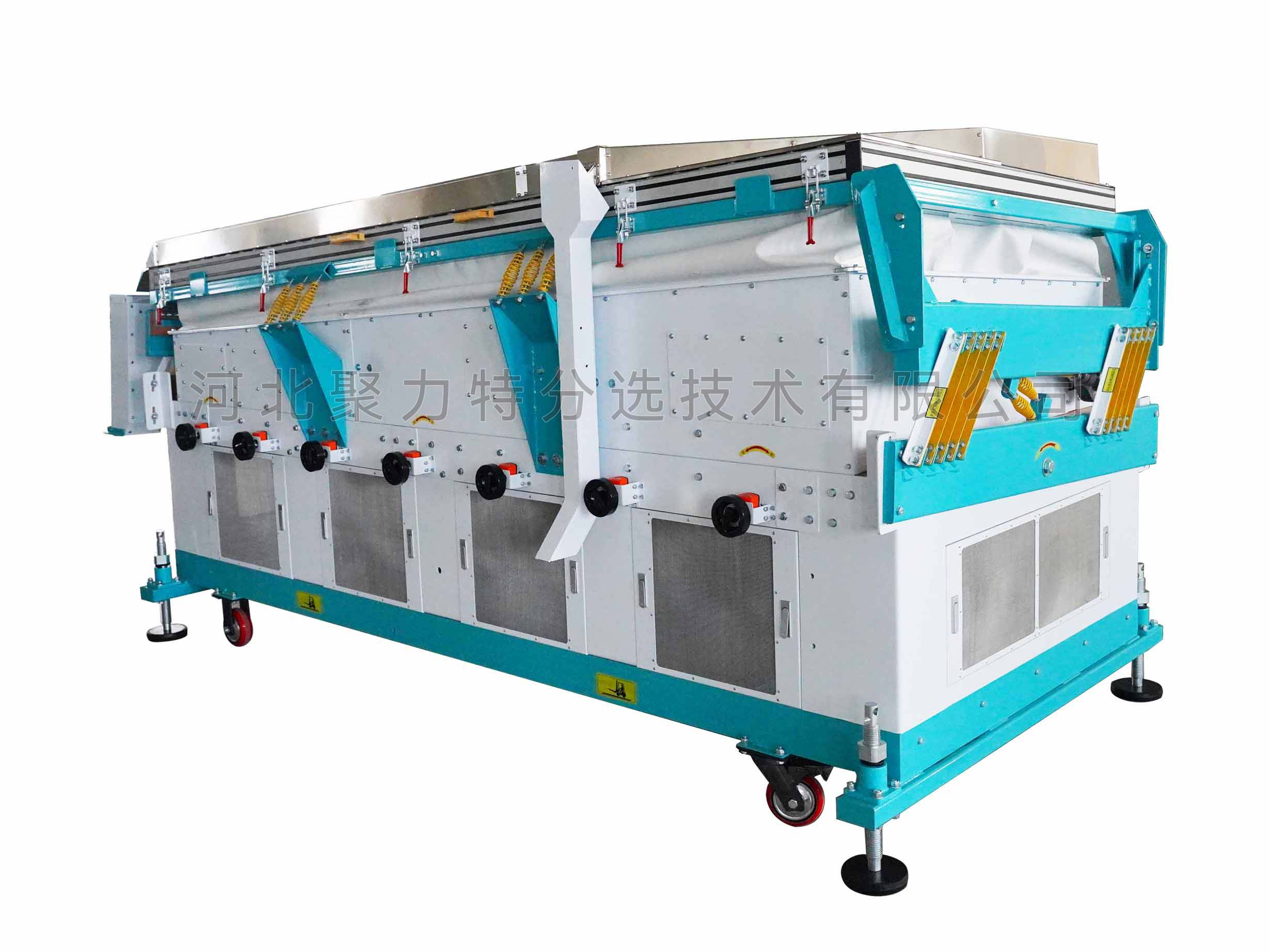 吹式比重精選機(jī)是根據(jù)物料在空氣動(dòng)力和振動(dòng)摩擦力的雙重作用下產(chǎn)生比重偏析的原理,通過調(diào)整風(fēng)壓、振幅等技術(shù)參數(shù),使比重較大的物料沉到底部貼著篩面由低向高運(yùn)動(dòng);比重較小的物料懸浮在表面由高向低運(yùn)動(dòng),從而達(dá)到比重分離的目的。有效去除物料中的秕籽、芽籽、蟲蛀粒、霉變粒、黑粉病粒等比重較輕的雜質(zhì);同時(shí)比重精選機(jī)振動(dòng)臺(tái)面上部設(shè)有一個(gè)去石傾角,能將物料中的石子分離出來。